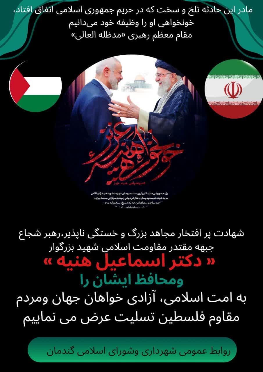 شهادت پر افتخار مجاهد بزرگ و خستگی ناپذیر،رهبر شجاع جبهه مقتدر مقاومت اسلامی شهید بزرگوار« دکتر اسماعیل هنیه »