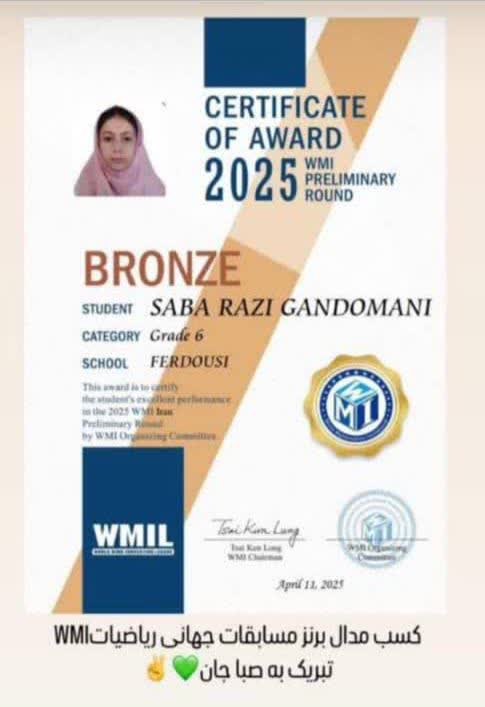 شهرداری گندمان کسب مدال ارزشمند برنز توسط دانش‌آموز نخبه و بااستعداد صبا رضی گندمانی در مسابقات جهانی ریاضیات WMIرا صمیمانه تبریک می‌گوید.