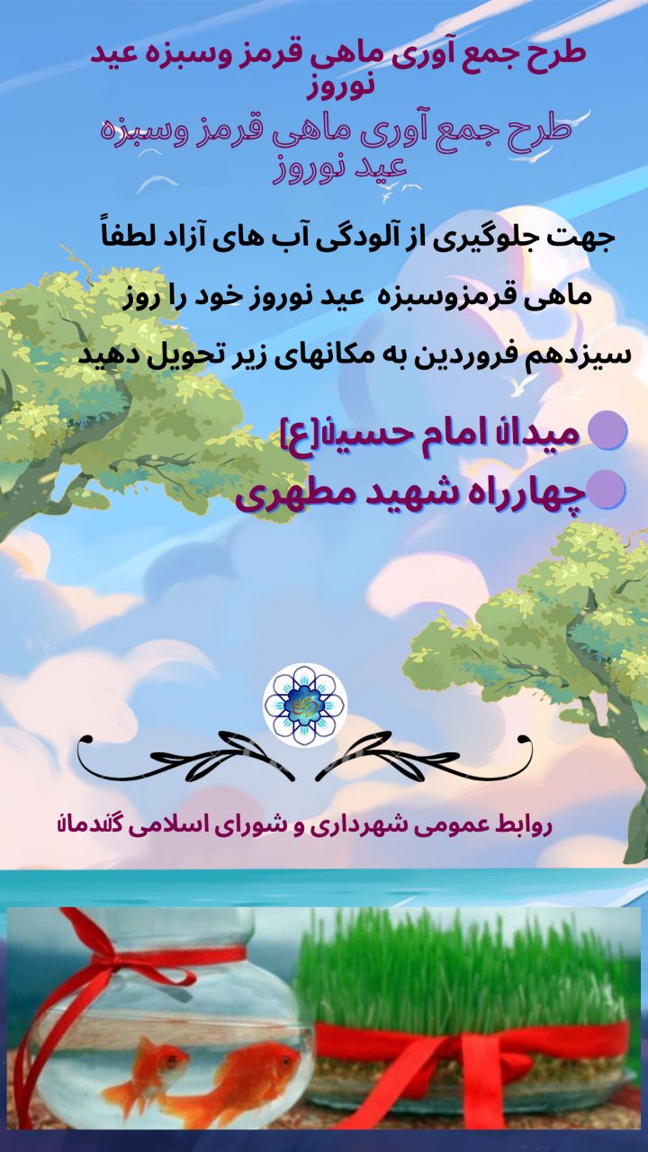 جهت جلوگیری از آلودگی آب های آزاد لطفاً ماهی قرمزوسبزه عید نوروز خود را روز سیزدهم فروردین به مکانهای زیر تحویل دهید.