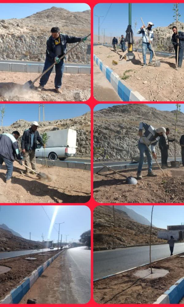 بلوار جدید الاحداث ورودی شهر گندمان باکاشت درخت شاه توت و درختچه گل زینتی درراستای توسعه فضای سبز شهری زیبا سازی می شود .